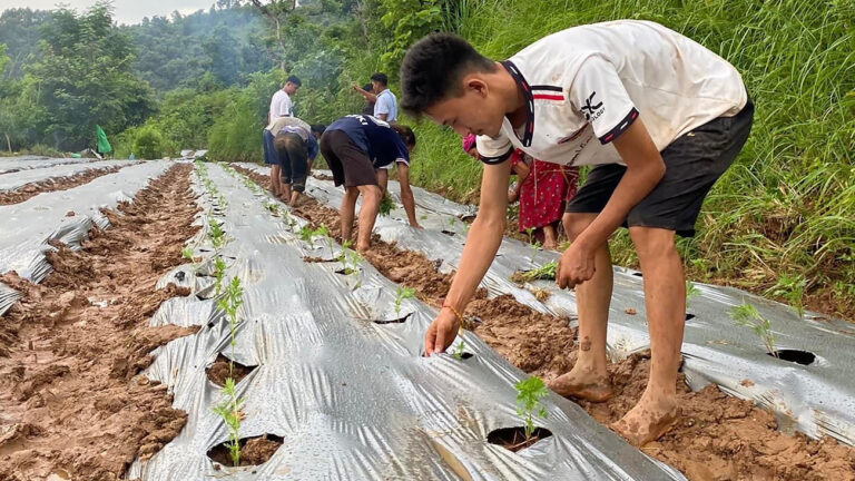 तनहुँको म्याग्दे गाउँपालिका–४ मा पुष्प खेती विकास कार्यक्रमअन्तर्गत मल्चिङ प्रविधिबाट सयपत्रीको फूल खेती गर्दै युवा । गाउँपालिकाको ७५ प्रतिशत अनुदान सहयोगमा यहाँ फूल खेती गरिएको छ । तस्वीर : कृष्ण न्यौपाने/रासस