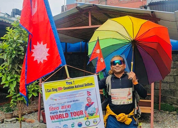 सबै देशका राष्ट्रगान गाउँदै विश्वयात्रा गर्ने लक्ष्य कठिन भए पनि विचलित नभई साधना र कर्ममा तल्लीन रहेको नेपालीको भनाइ छ । विश्वयात्राका क्रममा उनले हालसम्म ११ देशको भ्रमण गरिसकेको छ । नेपाली दुई वर्षअघि संयुक्त अरब इमिरेट्स (युएई) मा तीन महिना बिताएर आएको थियो । कोभिड–१९ महामारीयता उनको पहिलो विदेशयात्रा त्यही थियो । उनले विश्वयात्राका लागि सहयोगको पनि याचना गर्दै आएको छ । इष्टमित्र र शुभेच्छुकको सहयोगबाट केही देश पुग्न उनी सफल भएको हो ।