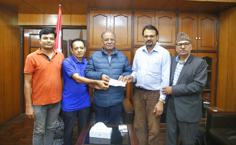 मंचका सहइञ्चार्ज युवराज भण्डारी, संयोजक राजेन्द्र शर्मा र केन्द्रीय सचीव नगेन्द्र ढकाल लगायतको प्रतिनिधि मण्डलले अध्यक्ष प्रचण्डलाई उनको निवास खुमलटारमा भेटगरी चेक हस्तान्तरण गरेको हो।