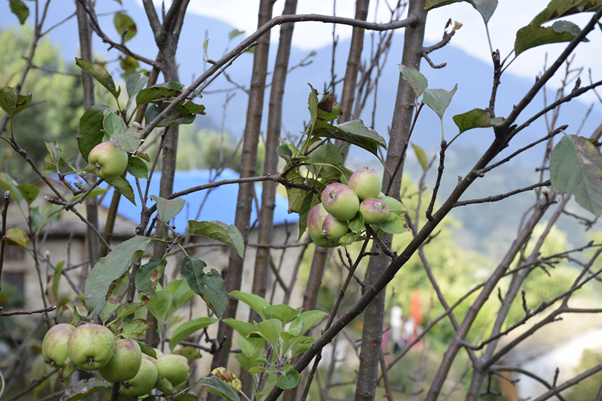 जोशीले भने, “गत चैतमा टुसाउँन सुरु भएको स्याउ फूलेर, फलेर असारमा सकियो । त्यसपछिका तीन महिना बोटमा पात मात्रै रहन्छ । अहिले तीन महिनापछि भने स्याउ सिधैँ लटरम्म फलेको देखियो ।”