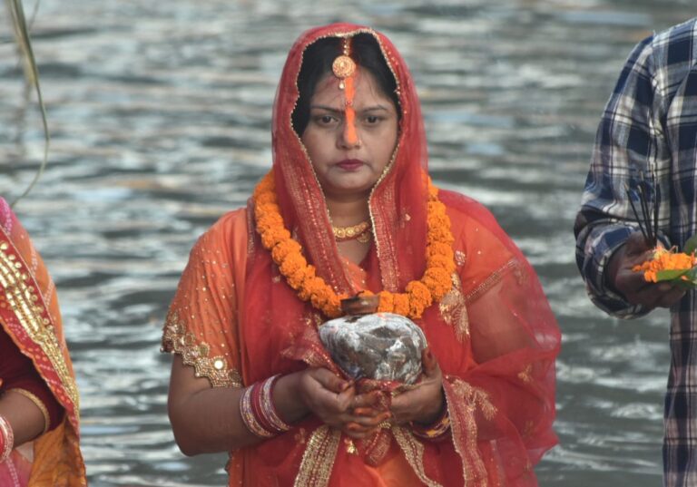 भक्तजनहरुले अस्ताउँदो सूर्यलाई अर्घ्य दिएर छठ पर्व मनाएका छन्। परिवार एवं सन्तानको सुख समृद्धिको कामना गर्दै अत्यन्त श्रद्धापूर्वक मनाइन्छ। राष्ट्रपति रामचन्द्र पौडेलले पनि गौरीघाटमा पुगेर छठ पूजा गरेका हुन्। तस्विर : मुकुन्द कालिकोटे