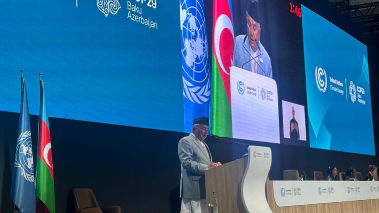 अजरबैजान, २८ कात्तिक । जलवायु परिवर्तनसम्बन्धी संयुक्त राष्ट्रसङ्घीय सम्मेलन (कोप–२९) मा सहभागी हुने सिलसिलामा यहाँ रहेका राष्ट्रपति रामचन्द्र पौडेलले आज नेपालका तर्फबाट एउटा उच्चस्तरीय सत्र सञ्चालन गर्दै गर्दैछन् ।