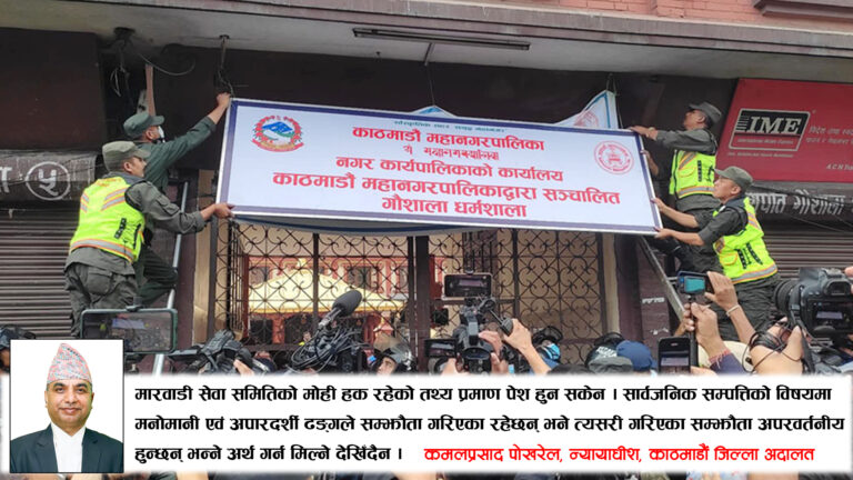 साथै, अदालतले धर्मशालामा निर्माण भएका घर जग्गा लगायतका भौतिक संरचानामाथि पशुपति अमालकोट कचहरीको पूर्ण स्वामित्वलाई मारवाडी सेवा समितिले स्वीकार गरेको तथ्यलाई पुष्टि गरेको देखिएको फैसला गरेको छ ।