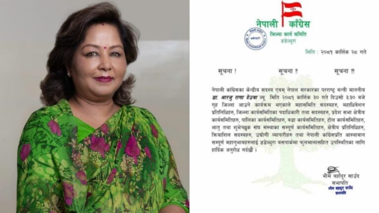 काठमाडौं । नेपाली कांग्रेसले डडेलधुरा आउन लागेकी कांग्रेसकी नेतृ तथा परराष्ट्रमन्त्री डा आरजु राणा देउवको स्वागतका लागि उपस्थित हुने उर्दी जारी गरेको छ । आज जिल्ला कार्यसमितिले एक विज्ञप्ति जारी गर्दै फूलमालासहित डडेल्धुरा बसपार्कमा जम्मा हुन उर्दी जारी गरेको हो ।