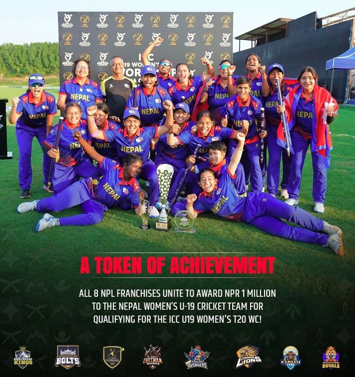 काठमाडौं । नेपाल प्रिमियर लिग (एनपीएल) का आठ फ्रेन्चाइज टिमले विश्वकपमा छनोट भएको नेपाली यु-१९ महिला टिमलाई १० लाख रुपैयाँ पुरस्कार दिने भएका छन् ।