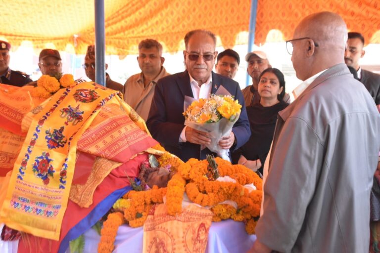 काठमाडौं । पूर्वसभामुख दमननाथ ढुङ्गानाको पार्थिव शरीर श्रद्धाञ्जलीका लागि आज बिहान ११ बजेदेखि ज्ञानेश्वरस्थित सानो गौचरणमा राखिएको छ । ढुंगानाको पार्थीव शरीरमा नेकपा माओवादी केन्द्रका अध्यक्ष पुष्पकमल दाहाल प्रचण्डले श्रद्धाञ्जली अर्पण गरेका छन् ।