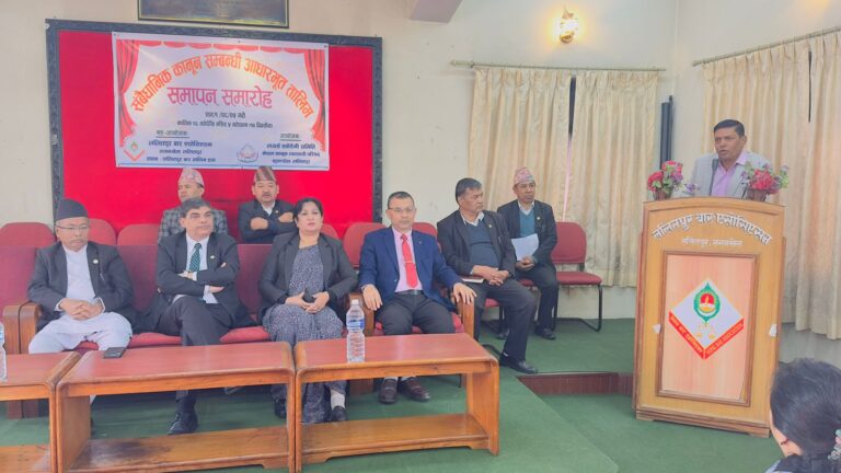 काठमाडौं, ५ मंसिर । नेपाल कानुन व्यवसायी परिषद्, लयर्स एकेडेमी समितिको आयोजना र ललितपुर बार एशोसिएशनको सह–आयोजनामा सञ्चालित ‘संवैधानिक कानुन’ सम्बन्धी आधारभूत तालिम सम्पन्न भएको छ । गत कार्तिक २६ गतेदेखि ललितपुर बारमा सञ्चालित उक्त तालिम आज सम्पन्न भएको हो ।