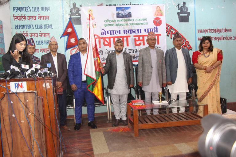 काठमाडौं, ६ मंसिर । डा.महेन्द्रजंग शाहको अध्यक्षतामा नेपाल एकता पार्टी घोषणा भएको छ । आज (बिहीबार) रिपोर्टर्स क्लब नेपालमा आयोजित समारोहबीच पार्टी घोषणा गरिएको हो । नेपाल एकता पार्टीको उपाध्यक्षहरुमा हिरा आचार्य, टीका नेपाल, धर्म सुवेदी, महासचिव भुपेन्द्र भण्डारी, प्रवक्ता नविन महतो रहेका छन् ।