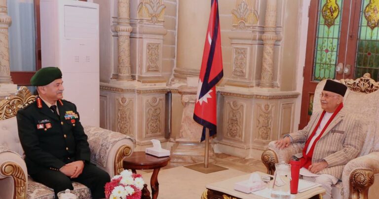 प्रधानमन्त्री ओलीसँग भारतीय स्थल सेनाध्यक्ष द्विवेदीको भेटवार्ता