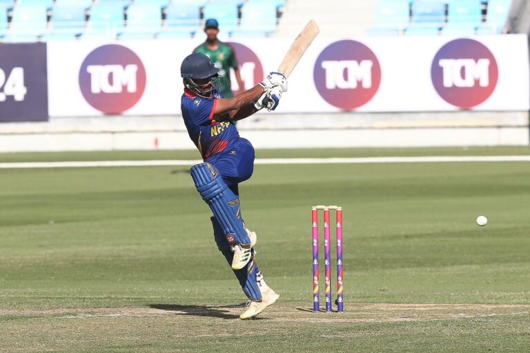 ताजा अवस्थामा नेपालले ३२ ओभरमा ६ विकेट गुमाएर ८७ रन जोडेको छ । नेपालका लागि आकाश त्रिपाठीले सबैभन्दा धेरै ४३ रन जोडेका छन् । ७७ बलको सामना गरेका उनले ५ चौका हिर्काएका थिए । मयन यादव र नरेन भट्ट समान ४ रनमा आउट हुँदा सन्तोष यादव ७ र अर्जुन कुमाल शून्य रनमा आउट भए ।