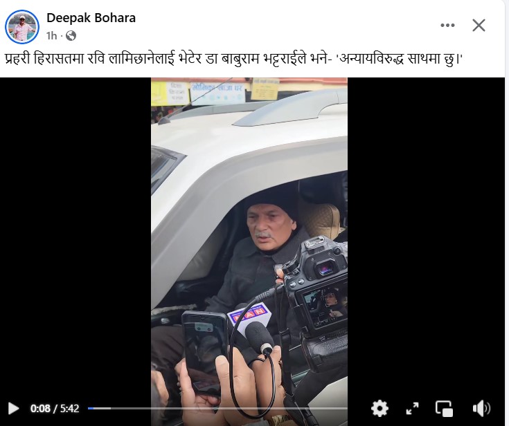 काठमाडौं, २१ मंसिर । नेपाल समाजवादी पार्टीका अध्यक्ष तथा पूर्व प्रधानमन्त्री डा. बाबुराम भट्टराईले सहकारी ठगी प्रकरणमा प्रहरी हिरासतमा रहेका रवि लामिछानेसँग भेट गरेका छन् । उनले लामिछानेलाई राज्यले प्रतिशोधपूर्ण व्यवहार निकालेको प्रतिक्रिया दिएका छन् । उनले रवि लामिछानेप्रति आफ्नो सधैं सद्भाव नै रहेको पनि विश्वास दिलाए ।