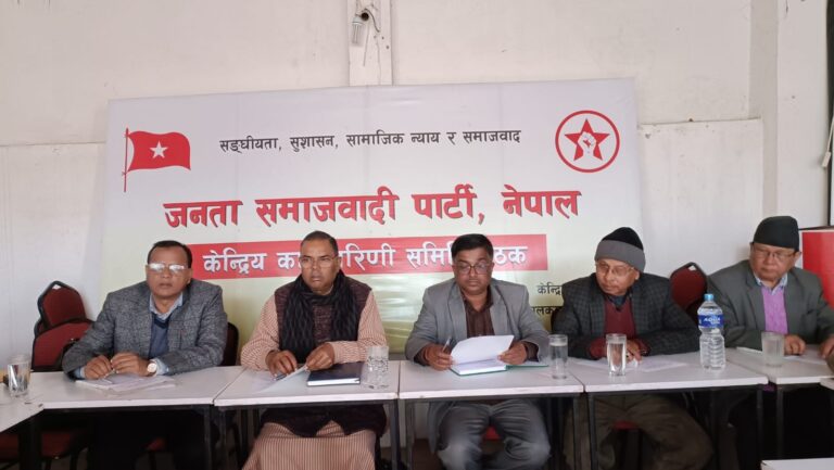 काठमाडौं २८, मंसिर । जनता समाजवादी पार्टी नेपालको कार्यकारिणी समितिको पूर्ण बैठक भर्खरै सुरु भएको छ । केन्द्रीय कार्यालय बालकुमारी ललितपुरमा पार्टी अध्यक्ष उपेन्द्र यादवको अध्यक्षतामा मंसिर २८ र २९ गतेका लागि बोलाइएको बैठक भोलि शुक्रबारसम्म चल्नेछ ।
