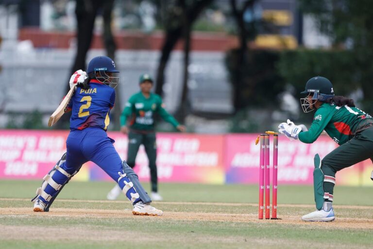 काठमाडौं । वर्षाका कारण ११ ओभरमा झारिएको नेपाल र बंगलादेशबीचको एसीसी महिला यू–१९ एसिया कपअन्तर्गत सुपर–४ को खेलमा नेपालले ५५ रनको लक्ष्य पेश गरेको छ ।