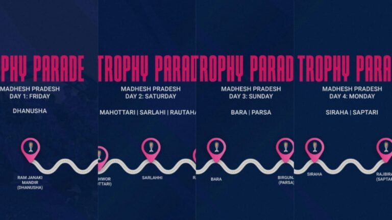 शुक्रबारदेखि सुरु हुने परेडको पहिलो दिन धनुषास्थित राम जानकी मन्दिरमा तय गरिएको छ । शनिबार मोहत्तरी, सर्लाही र रौतहटमा ट्रफी परेड गरिनेछ । तेस्रो दिन आइतबार बारा र पर्सामा परेड गरिने र अन्तिम दिन अर्थात सोमबार सिराहा र सप्तरीमा ट्रफी परेड गरिनेछ ।