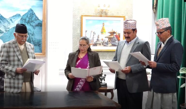 काठमाडौं । प्रधानमन्त्री केपी शर्मा ओलीसमक्ष विभिन्न तीन विश्वविद्यालयका नवनियुक्त उपकुलपतिहरुले आज पद तथा गोपनीयताको शपथ लिएका छन् ।