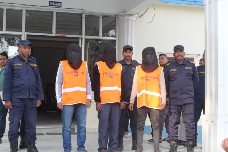 काठमाडौं । प्रहरीका कार्यलय सहयोगी राजकुमार रुम्बाको हत्या प्रकरणमा पक्राउ परेका तीन जना सार्वजनिक भएका छन् । आइतबार जिल्ला प्रहरी कार्यालय बाराले उनीहरुलाई सार्वजनिक गरेको हो । पक्राउ पर्नेमा जितपुर सिमरा १९ घर भई जय माँ इन्जियरिङ वर्कसपक सञ्चालन गरिरहेका संचालक २७ वर्षको पुरुषोत्तम कुमार दास, ईन्द्रजित कुमार चौहान र श्रीकान्त तिवारी छन् ।