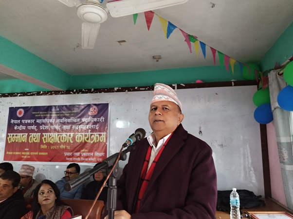 एमाले दाङको प्रचार तथा प्रकाशन विभागले नेपाल पत्रकार महासङ्घका नवनिर्वाचित पदाधिकारी, केन्द्रीय पार्षद्, प्रदेश पार्षद् तथा सदस्यहरूको सम्मानमा आज दाङको घोराहीमा आयोजना गरको कार्यक्रममा महासचिव पोखरेलले मुलुकमा राजनीतिक स्थिरता, अर्थतन्त्र सुधार र सुशासनका पक्षमा काम गरिरहेको सरकारलाई साथ दिन सबैसँग अनुरोध गरे ।