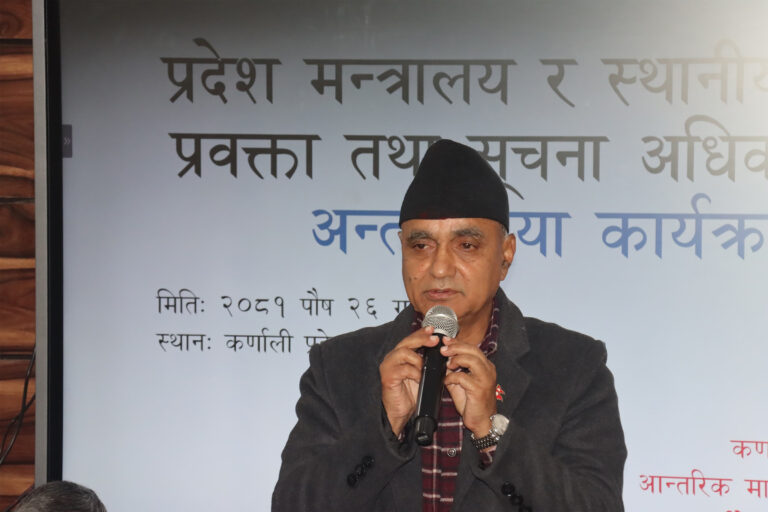 आन्तरिक मामिला तथा कानुन मन्त्रालयद्वारा आज सुर्खेतको वीरेन्द्रनगरमा आयोजित प्रदेश मन्त्रालय र स्थानीय तहका प्रवक्ता तथा सूचना अधिकारीसँगको अन्तरक्रियामा उनले सही सूचना दिएर जनता सुसूचित हुन पाउने संवैधानिक हकको सम्मान गर्न आग्रह गरे ।