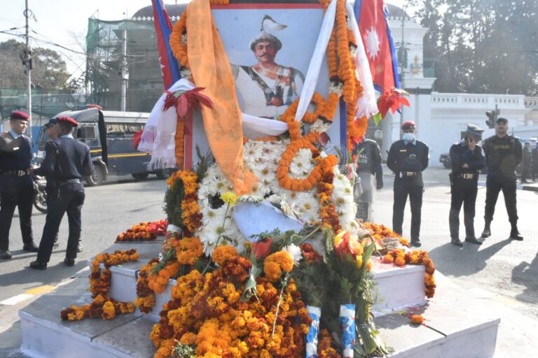 काठमाडौँ, २७ पुस । राष्ट्रपति रामचन्द्र पौडेलले ३०३ औँ पृथ्वी जयन्ती तथा राष्ट्रिय एकता दिवस अवसरमा सिंहदरबारको मूलगेट अगाडि रहेको पृथ्वीनारायण शाहको सालिकमा माल्यार्पण गरेका छन् ।