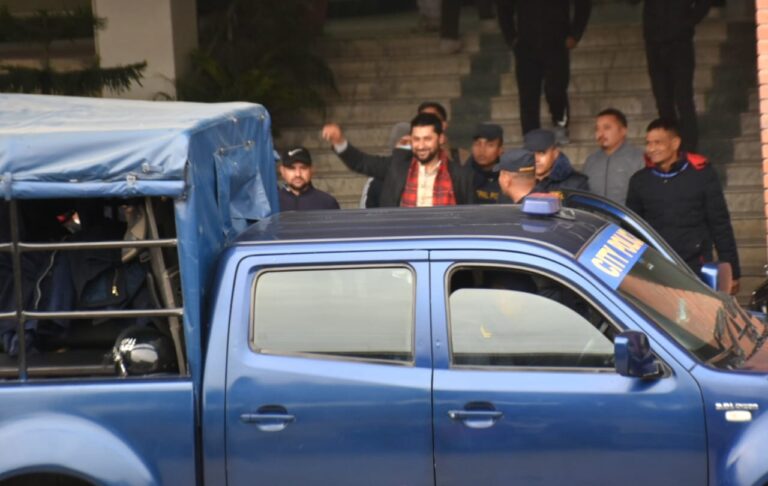 उनी अदालतबाट बाहिरिने क्रममा रास्वपाका नेता तथा कार्यकर्ता र समर्थकको बाक्लो भीड लागेको थियो । लामिछाने बाहिरिने क्रममा समर्थकहरुले ‘रवि दाई हाई हाई’ लगायतका नारा लगाएका थिए । फोटोः मुकुन्द कालिकोटे/रिपोर्टर्स नेपाल
