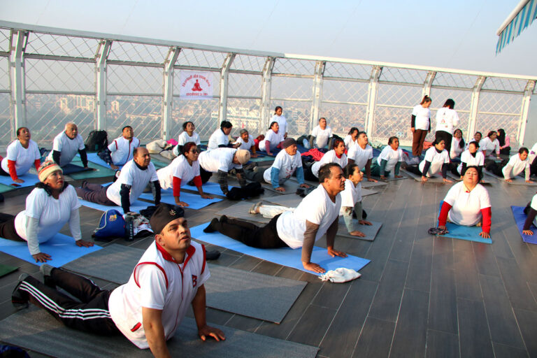 काठमाडौँ, १ माघ । कमलादिस्थित ‘स्काइवाक टावर’मा आज विभिन्न कार्यक्रम गरी दसौँ राष्ट्रिय योग दिवस मनाइएको छ । स्काइवाक, अष्टाङ्गयोग, योगभूमि, विश्व शान्ति ध्यान केन्द्रको संयुक्त आयोजनामा टावरको दुई सय ५६ फिटमाथिको स्काइवाकमा योगाभ्याससँगै योगबारे चर्चा गरिएको ‘स्काइवाक टावर’का प्रबन्ध निर्देशक विष्णुहरि पाण्डेले जानकारी दिए ।