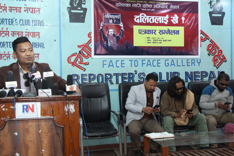 काठमाडौं, ८ माघ । दलितको लागि दलित अभियानले राज्यले दलित समुदायलाई संविधानमा लेखिएका कुराहरु नदिएर विभेद गरिरहेको बताएको छ । आज (मंगलबार) रिपोर्टर्स क्लब नेपालमा पत्रकार सम्मेलन गर्दै अभियानका अभियन्ताहरुले राज्यका हरेक तह र तप्कामा दलित समुदायको समानुपातिक प्रतिनिधित्व हुनुपर्नेमा त्यसो हुन नसकेको बताएका हुन् । सरकारले आफूहरुलाई दिएको आश्वासनहरु पूरा नगरेको उनीहरुले बताए ।