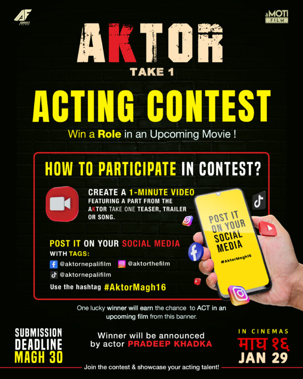 काठमाडौं : यही माघ १६ गते रिलिज हुने नेपाली चलचित्र ‘एक्टर: टेक वन’ले विजेतालाई महत्त्वाकाङ्क्षी अवसर दिने गरी ‘एक्टिङ कन्टेस्ट’ घोषणा गरेको छ । यो कन्टेस्टका एक जना विजेताले ‘एक्टर: टेक वन’को निर्माण कम्पनी अधृत फिल्म्स् प्रा.लि.ले निर्माण गर्ने आगामी चलचित्रमा अभिनयको लागि अवसर प्राप्त गर्नेछन् ।