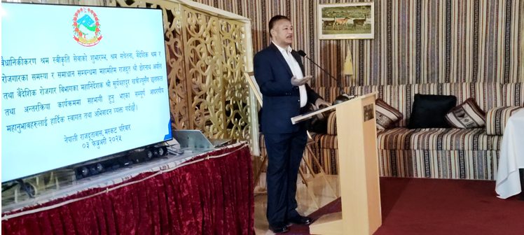 त्यस अवसरमा राजदूत अर्यालले नेपाली श्रमिकहरुको हकहित संरक्षणको लागि हरेक किसिमको सहयोग गर्न तत्पर रहेको बताए । महानिर्देशक खत्रीले श्रम स्वीकृति बिना विदेश आउँदा हुने समस्याबारे सचेत गराउनुभएको विज्ञप्तिमा उल्लेख छ । रासस