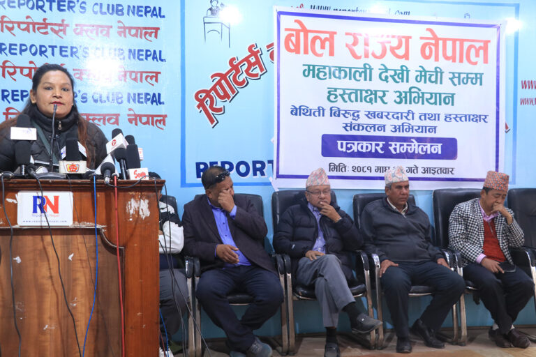 आज (आइतबार) रिपोर्टर्स क्लब नेपालमा पत्रकार सम्मेलन गरी महाकाली–मेची बोल राज्य नेपाल कार्यक्रमबारे जानकारी गराइएको हो । महाकाली–मेची बोल राज्य नेपाल अभियानमार्फत शोषित पीडित नागरिकको हस्ताक्षर संङ्कलन गरी राष्ट्रपतिसमक्ष पेश गरेर राज्यका सम्बन्धित निकाय तथा दलहरुलाई जवाफदेही तुल्याउने उद्देश्य रहेको बताइएको छ ।