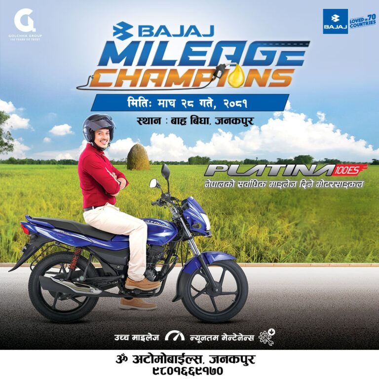 काठमाडौँ, २७ माघ । जनकपुरमा भोलि माघ २८ गते ‘बजाज माइलेज च्याम्पियन’ हुने भएको छ । बजाज कम्पनीको प्लाटिना मोटरसाइकलको उच्चतम माइलेज क्षमता प्रदर्शन गर्न माइलेज च्याम्पियनको आयोजना गरिएको हो । जनकपुरको बाह्र बिघास्थित ओम अटोमोबाइल्सले सोमबार यो कार्यक्रम आयोजना गर्ने भएको छ ।