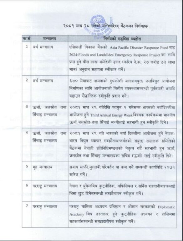 जसअन्तर्गत बैठकले एसियाली विकास बैंकबाट प्राप्त हुने २० लाख अमेरिकी डलर अनुदान सहायता स्वीकार गर्ने, दुधकोशी जलाशययुक्त जलविद्युत आयोजना निर्माणका लागि आयोजनाको वित्तीय व्यवस्थापसम्बन्धी पूर्व तयारी अगाडि बढाउन सैद्धान्तिक स्वीकृति प्रदान गरेको छ ।