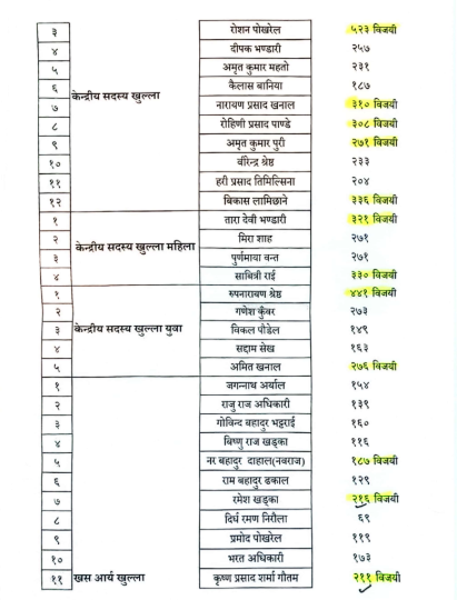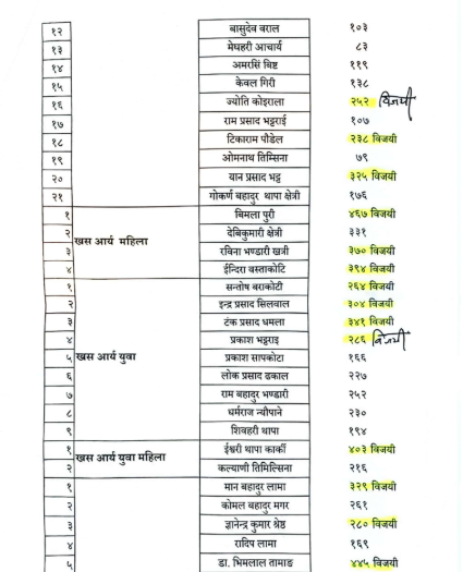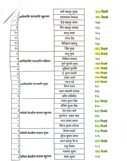उपाध्यक्षमा ईश्वर रिजाल, टेकबहादुर बाठा मगर र उमेश साह निर्वाचित भएका छन्। साथै उपाध्यक्षमा मानुषी यमी भट्टराई र दुर्गा सोब निर्विरोध भएका थिए। महासचिवमा सोनामसिं स्याङतान निर्वाचित भए।