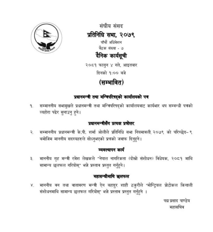 गृह मन्त्री रमेश लेखकले ‘नेपाल नागरिकता (दोस्रो संसोधन) विधेयक, २०८१ माथि सामान्य छलफल गरियोस भन्ने प्रस्ताव प्रस्तुत गर्नेछन भने बन तथा बातावरण मन्त्री ऐनबहादुर शाही ठकुरीले ‘मोन्ट्रियल प्रोटोकल किगाली संसोधनमाथि सामान्य छलफल गरियोस्’ भन्ने प्रस्ताव प्रस्तुत गर्ने महासचिव पदमप्रसाद पाण्डेले सार्बजनिक गरेको सम्भावित कार्यसूचीमा उल्लेख गरिएको छ ।