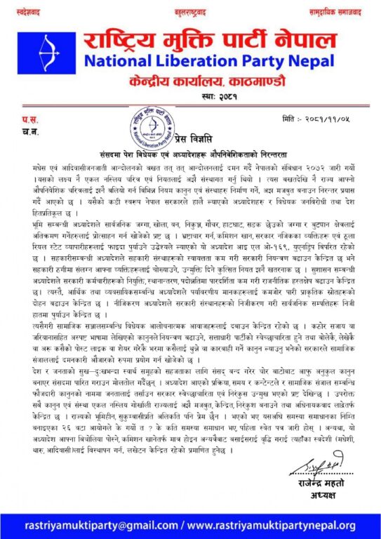 ‘राज्य आफ्नो औपनिवेशिक चरित्रलाई झनै बलियो गर्न बिभिन्न नियम कानुन एवं संस्थाहरु निर्माण गर्ने, अझ मजबुत बनाउन निरन्तर प्रयास गर्दै आएको छ । यसैको कडी स्वरूप नेपाल सरकारले हालै ल्याएको अध्यादेशहरु र विधेयक जनविरोधी तथा देश हितप्रतिकूल छ’ विज्ञप्तिमा भनिएको छ ।