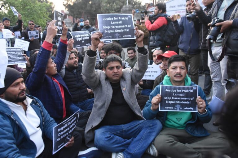 काठमाडौं, ५ फागुन । नेकपा (एमाले) निकट विद्यार्थी संगठन अखिल नेपाल स्वतन्त्र विद्यार्थी युनियन (अनेरास्ववियु) ले भारतको एक छात्रावासमा नेपाली छात्रा प्रकृति लम्सालको निधनको घट्नामा न्याय माग्दै नेपालस्थित् भारतीय दूतावासअघि प्रदर्शन तथा धर्ना दिएको छ ।