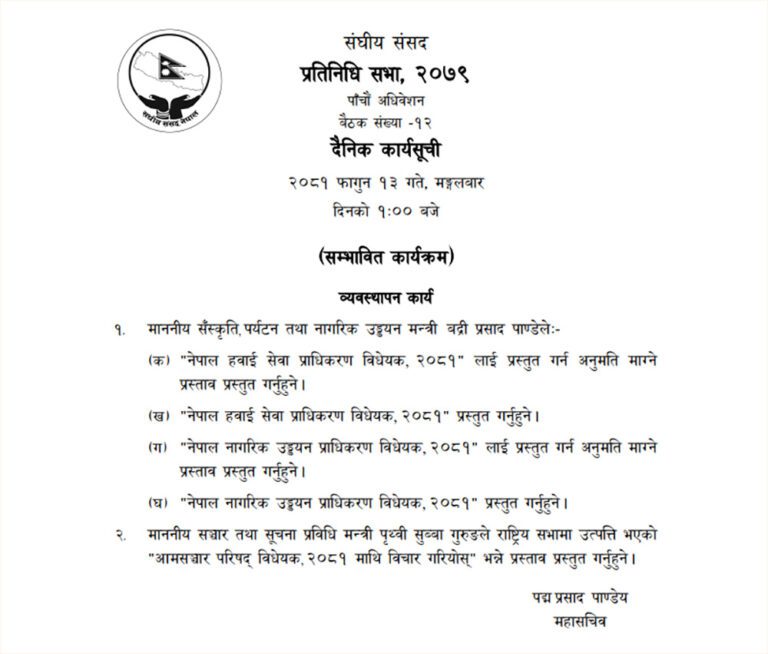 काठमाडौं, फागुन १३ । प्रतिनिधिसभा बैठक बस्दैछ । संघीय संसद भवन नयाँ बानेश्वरमा उक्त बैठक बस्नेछ । सो बैठक दिउँसो १ बजे बोलाइएको छ ।संसद सचिवालयका अनुसार आजको बैठकमा संस्कृति, पर्यटन तथा नागरिक उडड्यन मन्त्री बद्री पाण्डेले नेपाल हवाई सेवा प्राधिकरण विधेयक, नेपाल नागरिक उड्डयन प्राधिकरण विधेयक प्रस्तुत गर्ने कार्यक्रम रहेको छ ।