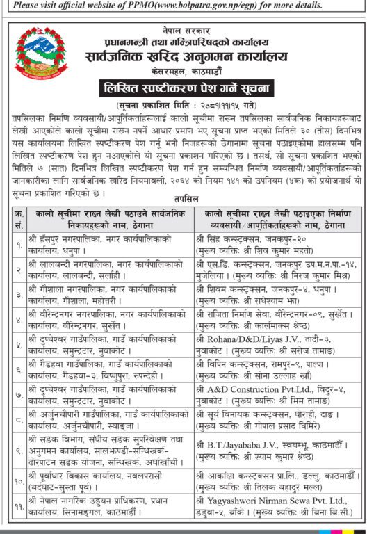 जसमा जनकपुरका शिव कुमार महतोको सिंह कन्स्ट्रक्सन, निरज कुमार मिश्रको एसडी कन्स्ट्रक्सन, राधेश्याम झाको शिवम् कन्स्ट्रक्सन रहेका छन्। यस्तै कार्लमाक्स श्रेष्ठको राजिता निर्माण सेवा सुर्खेत, सोना उल्लाह खाँको विपिन कन्स्ट्रक्सन पाल्पा, भिम तामाङको ए एण्ड डी कन्स्ट्रक्सन, गोपाल प्रसाद घिमिरेको सूर्यविनायक कन्स्ट्रक्सन दाङलाई समेत स्पष्टीकरण सोधिएको छ ।