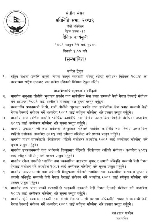 काठमाडौं, २० फागुन । सरकारले पछिल्लो समय ल्याएको ५ वटा अध्यादेश प्रतिनिधि सभाको कार्यसूचीमा राखिएको छ । भोलि बस्ने प्रतिनिधि सभाको बैठकमा ती अध्यादेशहरु टेबुल गर्ने सरकारको तयारी रहेको छ ।