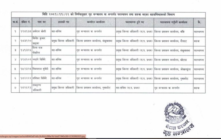 काठमाडौं । गृह मन्त्रालयले ७ जना सहसचिवको सरुवा गरेको छ । प्रमुख जिल्ला अधिकारी रिक्त रहेका जिल्लामा सहसचिवको सरुवा गरिएको हो ।