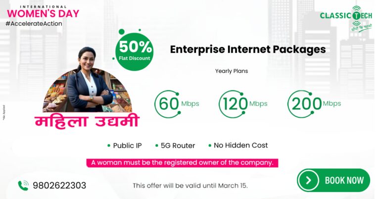 काठमाडौं, २३ फागुन । इन्टरनेट नेटवर्क सेवाप्रदायक कम्पनी क्लासिक टेकले अन्तर्राष्ट्रिय नारी दिवस (२०२५) को अवसरमा उधमी महिलाहरुको लागि ५०% फ्ल्याट डिस्काउन्ट मा उधमी प्याकेज अफर सार्वजनिक गरेको छ ।