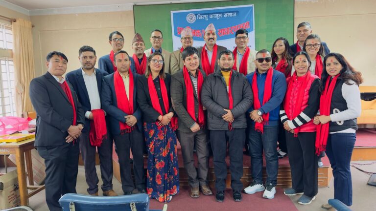 काठमाडौं, २४ फागुन । सिन्धु कानुन समाजको पहिलो वार्षिक साभारण सभा सम्पन्न भएको छ । आज (शनिबार) नेपाल बार एशोसियशनको हलमा समाजका अध्यक्ष अधिवक्ता रामहरि नेपालको अध्यक्षता तथा नेपाल बार एशोसियशनका अध्यक्ष वरिष्ठ अधिवक्ता गोपाल कृष्ण घिमिरेको प्रमुख आतिथ्यतामा पहिलो वार्षिक साधारणसभा सम्पन्न भएको हो ।