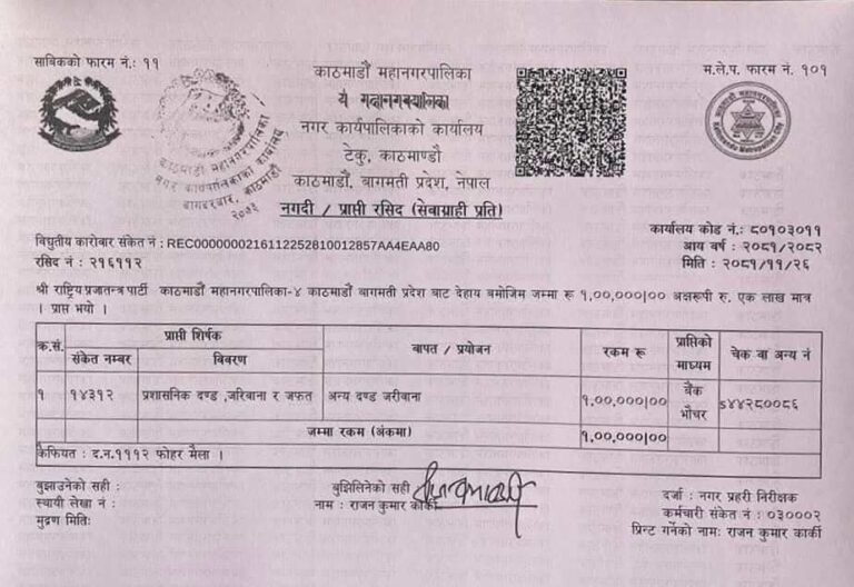 काठमाडौं, २६ फागुन । राष्ट्रिय प्रजातन्त्र पार्टी (राप्रपा) ले काठमाडौं महानगरपालिकालाई एक लाख रुपैयाँ जरिवाना बुझाएको छ । महानगरपालिकाले पूर्वराजाको स्वागतका क्रममा भएको प्रदर्शनमा वातावरणीय प्रदूषण भएको र सार्वजनिक स्थलमा फोहोर फैलिएको आरोप लगाउँदै जरिवाना गरेको थियो ।