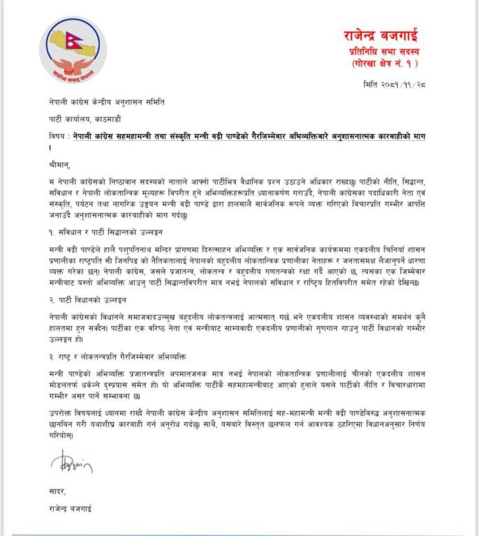 काठमाडौं, १ चैत । नेपाली कांग्रेसका सहमहामन्त्रीसमेत रहेका संस्कृति पर्यटन तथा नागरिक उड्यन मन्त्री बद्री पाण्डेलाई कारबाहीको माग गर्दै पार्टी केन्द्रीय अनुशासन समितिमा उजुरी परेको छ । मन्त्रीसमेत रहेका पाण्डेमाथि गैरजिम्मेवार अभिव्यक्तिबारे अनुशासनात्मक कारबाहीको माग राख्दै गोरखा क्षेत्र नं. १ बाट निर्वाचित राजेन्द्र बजगाईले उजुरी दिएका हुन् ।
