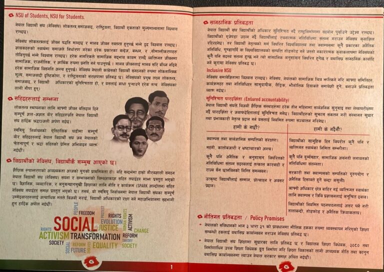 काठमाडौं, १ चैत । नेपाल विद्यार्थी संघ (नेविसंघ) ले स्वतन्त्र विद्यार्थी युनियन (स्ववियू) को चुनावी घोषणापत्र सार्वजनिक गरेको छ । आज (शुक्रबार) रिपोर्टर्स क्लब नेपालमा पत्रकार सम्मेलन गर्दै नेविसंघले घोषणापत्र सार्वजनिक गरेको हो ।
