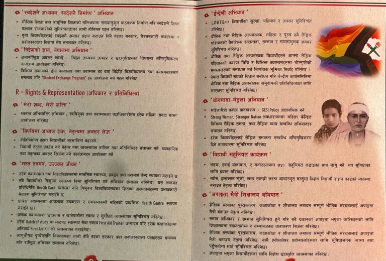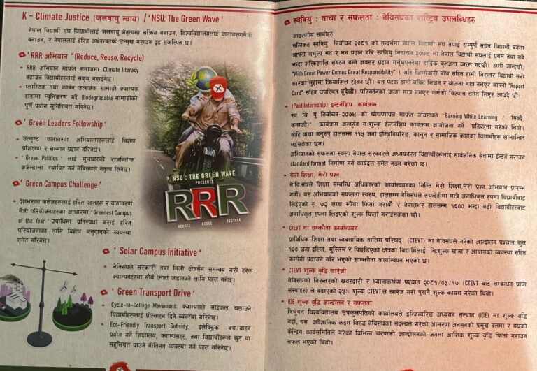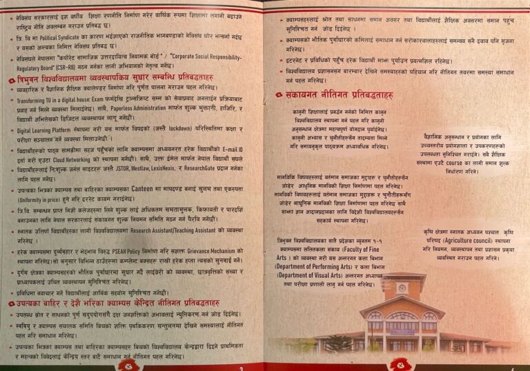 त्यस्तै, त्रिभुवन विश्वविद्यालयका हालसम्मका सम्पूर्ण शोधपत्रहरू सङ्ग्रह गरी अभिलेख निर्माण गरिने, क्याम्पस परिसरमा सस्तो तथा निःशुल्क छात्रवासको व्यवस्था गर्न पहल गर्ने, व्यवहारिक शिक्षा सुधार तथा ‘पेड ईन्टर्नसिप’ कार्यक्रमको समेत अगाडि सार्ने नेविसंघको घोषणा पत्रमा उल्लेख छ ।