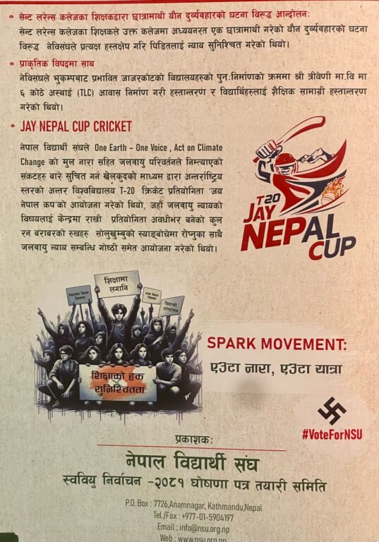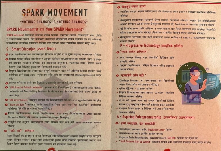 नेविसंघका अध्यक्ष दुजाङ शेर्पाले नेविसंघले विगतमा आफूहरुले गरेको वाचा सबै पूरा गरेको बताए । नेविसंघ विद्यार्थीको हक, हित र मुद्दामा इमानदार रहेको उनको भनाइ छ । विद्यार्थी आन्दोलनलाई रिब्राण्डिङ गर्न आफूहरुले स्पार्क मुभमेन्टलाई अगाडि बढाएको उनले बताए । ‘नेपाल विद्यार्थी संघले जे बोल्छ, त्यही गर्छ । हामीले बोलेका पनि छौं, गरेर देखाएका पनि छौं,’– उनले भने ।