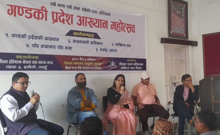 काठमाडौं, चैत ३ । नेपाल प्रज्ञा–प्रतिष्ठान साहित्य गद्य विभागको आयोजना र गीतल प्रतिष्ठान तथा नाटकमञ्च तनहुँको सहआयोजनामा शनिबार दमौलीमा गण्डकी प्रदेश आख्यान महोत्सव गरिएको छ ।