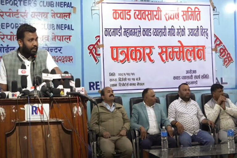 काठमाडौं, ११ चैत । कवाड व्यवसायी समाज नेपालले काठमाडौं महानगरपालिकाले कवाड व्यवसायीमाथि गरिरहेको ज्यादती तत्काल रोक्न माग गरेको छ । आज (सोमबार) रिपोर्टर्स क्लब नेपालमा पत्रकार सम्मेलन गर्दै कवाड व्यवसायी समाजले आफूहरुमाथि महानगरले गरिरहेको ज्यादती रोकेर सहज ढंगले व्यवसाय गर्ने वातावरण निर्माण गरिदिन आग्रह गरेको हो । आफूहरुमाथि भइरहेको ज्यादती नरोकिएको खण्डमा थप संघर्षका कदमहरु अगाडि बढाउने उनीहरुको चेतावनी छ ।