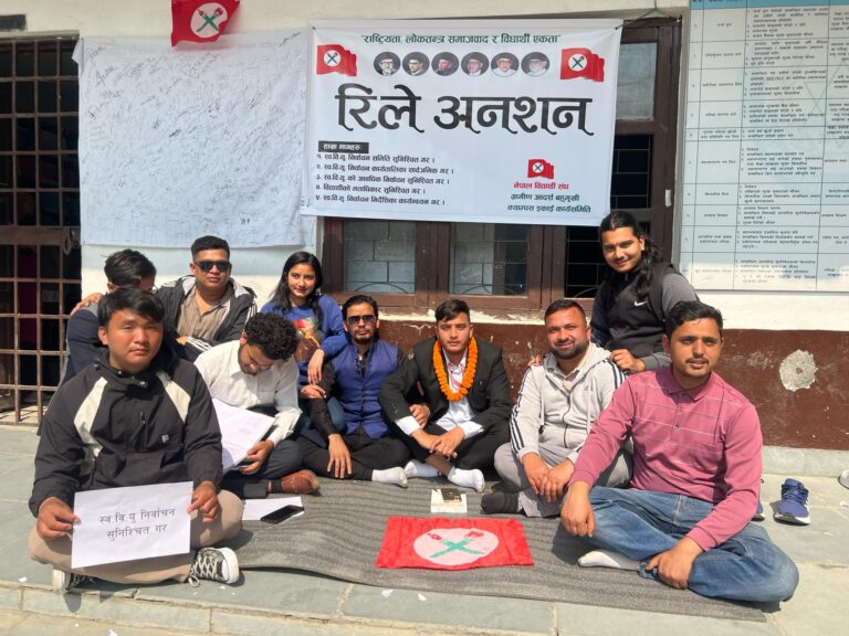 त्रिभुवन विश्वविद्यालयले गत चैत ५ गतेका लागि स्ववियु निर्वाचन तोकिएकोमा सबै तयारी पूरा हुँदासमेत विभिन्न बहानामा निर्वाचन रोकिएको थियो । नेविसंघले निर्वाचन जित्ने भएसँगै विभिन्न बहानामा निर्वाचन रोकिएको र त्यसको सुनिश्चितताको माग गर्दै रिले अनसन सुरु गरिएको नेविसंघ ग्रामीण आदर्श बहुमुखी क्याम्पसका ईकाइ अध्यक्ष महेशमणी पौडेलले जानकारी दिए ।