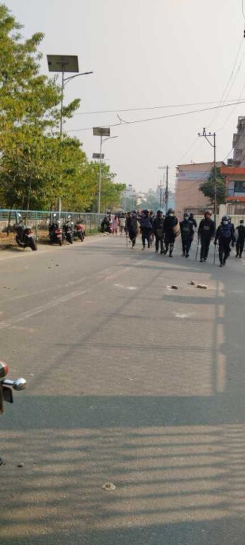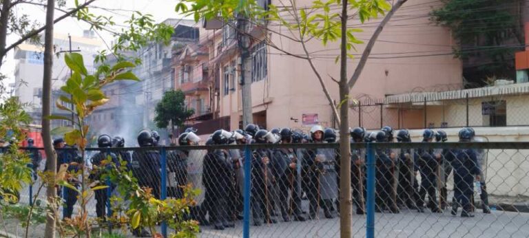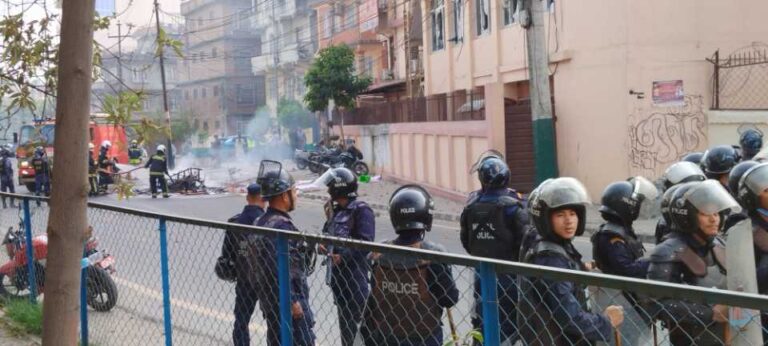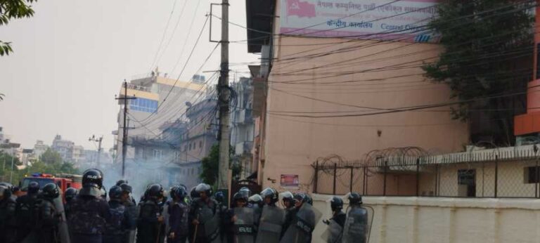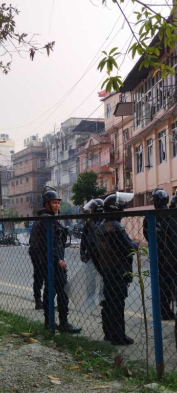 यो समाचार तयार पार्दासम्म माओवादी मुख्यालय हाताभित्र प्रदर्शनकारी प्रवेश गर्न पाएका छैनन् । त्यहाँ ठूलो संख्यामा माओवादीका कार्यकर्ताहरु र प्रहरी तैनाथ छन् । तर, माधव नेपालको दलको मुख्यालयमा भने प्रदर्शनकारी पुगेर तोडफोड गरेका थिए । Photo By: Ramgopal Raya Yadav